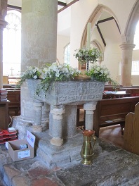 The Font, adjacent to this window, is about the same age as the church and is typical of early Sussex work. It was removed from the church, during the Civil War and its weather-beaten and rather battered appearance may be the result of it having been buried during this time. It was re-erected in 1660. There is a drain, from the font, which discharges just above the tiled floor. An Edict requires that the water in the font, which has been blessed, should be collected and cast away outside the church. In the old days, it was suspected that if this action was not taken, the water might be used for witchcraft purposes.